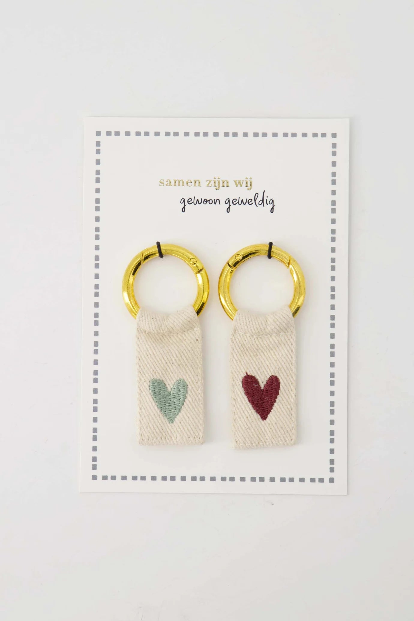 De Zusss sleutelhangers met ansichtkaart zijn een charmante combinatie van eenvoud en warmte. Deze sleutelhangers vallen op door het zachte wit katoenen bandje met een geborduurd hartje in rood en grijsblauw. De goudkleurige ring maakt het geheel klassiek en stijlvol. De ansichtkaart draagt de tekst "samen zijn wij gewoon geweldig" en is een mooie manier om je waardering te tonen. Perfect als klein cadeautje of om jezelf mee te verwennen, deze sleutelhangers brengen een liefdevolle touch aan elke sleutelbos.