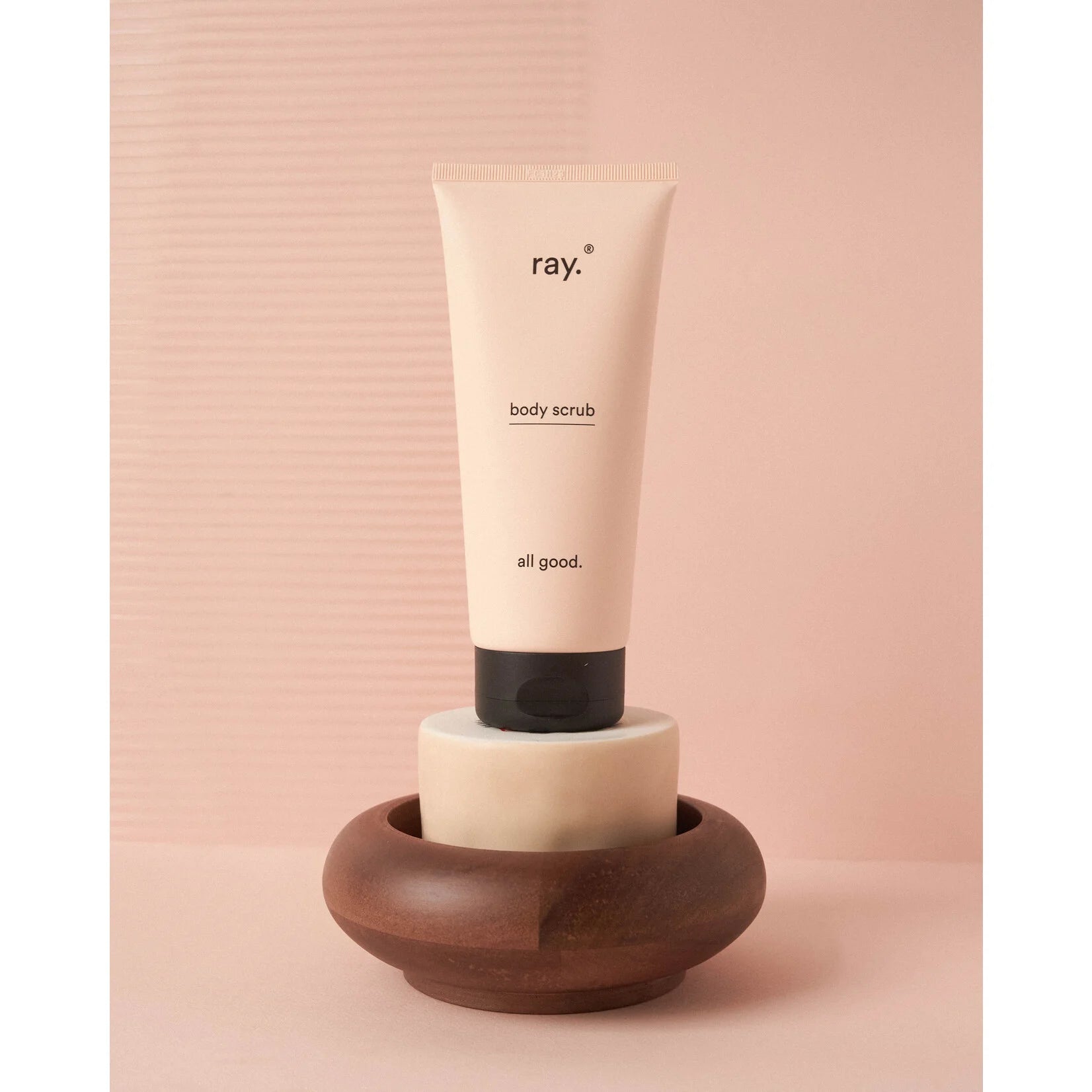 Breng de scrub aan op je handen en masseer deze zachtjes in cirkelvormige bewegingen op je huid. De geltextuur verandert in een zacht schuim tijdens het scrubben. Nadien grondig afspoelen en de huid zacht afdrogen. Sluit je verzorging af met de Ray Body Lotion.