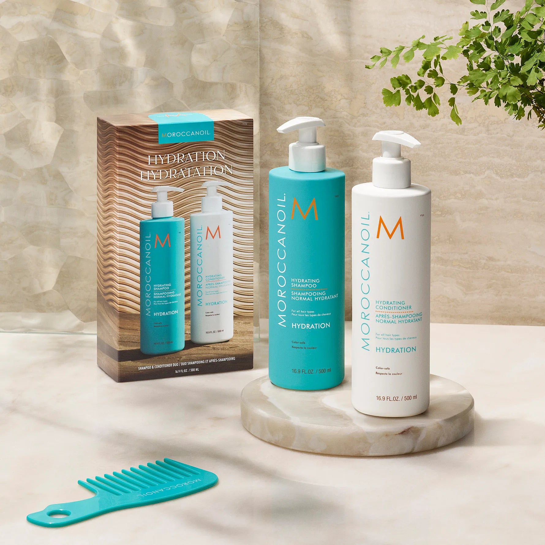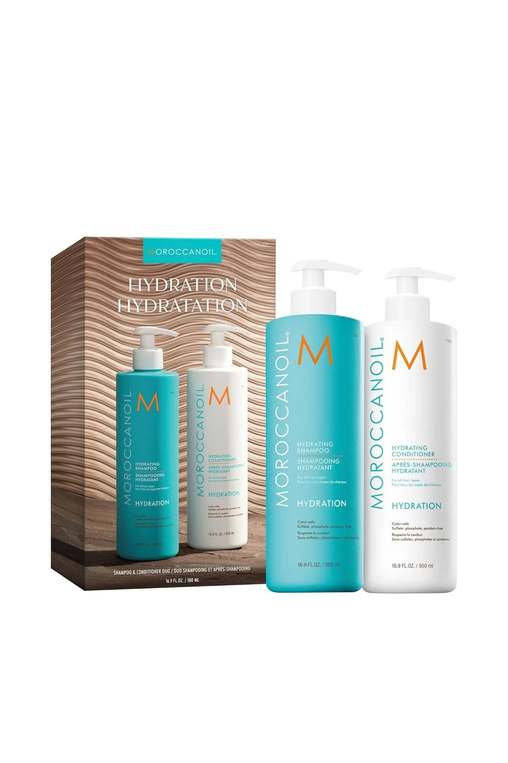 De Moroccanoil Hydrating Shampoo en Conditioner 500 ml in extra groot formaat is speciaal samengesteld om uitgedroogde lokken te voeden met een krachtige hydratatie. Verrijkt met arganolie en dagelijks verzorgende formules met vitaminen. Geniet van deze populaire Moroccanoil shampoo en conditioner in een speciaal geprijsde bundel die het haar optimaal hydrateert en tegelijkertijd zacht reinigt en verzacht.