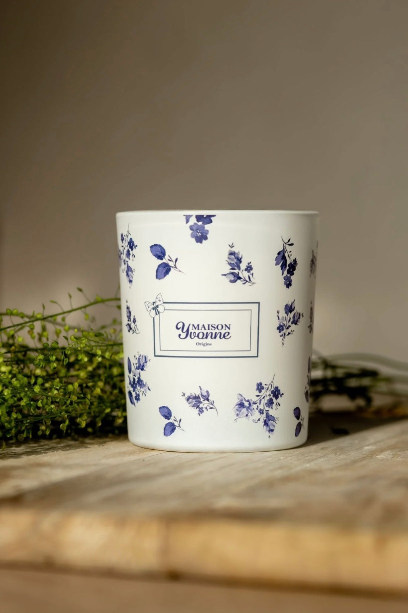 Origine staat voor puurheid en rust, ze omarmt je met warmte en sereniteit. Ze is uniek, ze komt in een wit glas afgewerkt met onze unieke blauwe bloemen. Hormoonproef en vol liefde! Gemaakt met koolzaadwas zodat je lijf en sfeer je dankjewel zeggen.