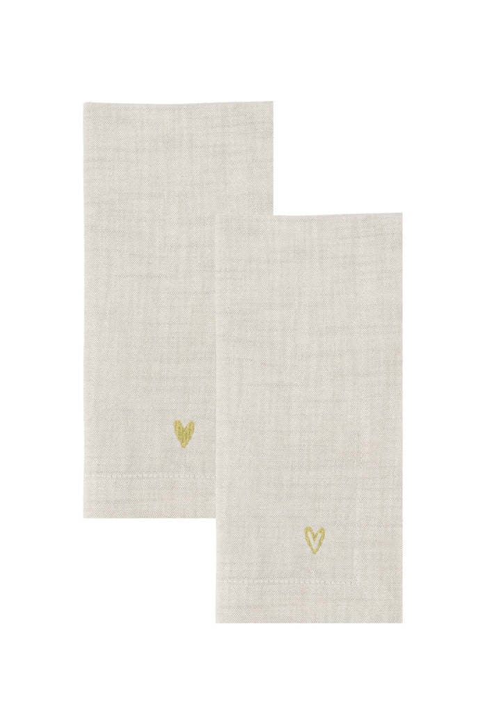Met deze set van 2 katoenen servetten in peper en zoutkleur vrolijk je elke tafel op. Elke servet heeft een gouden hartje.