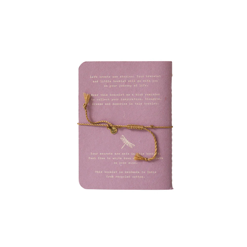 Maak kennis met ons Verhalenboek New Adventures. Een mini-notitieboek met 72 pagina's. De armband heeft een messing munt met een libelle symbool en een schuifknoop van katoendraad. Het verhalenboek is 8 cm x 11 cm (A7 formaat). De kaften van al onze boekjes zijn gemaakt van gerecycled materiaal. Reststukken uit de kledingindustrie worden omgezet naar deze mooie kaften.