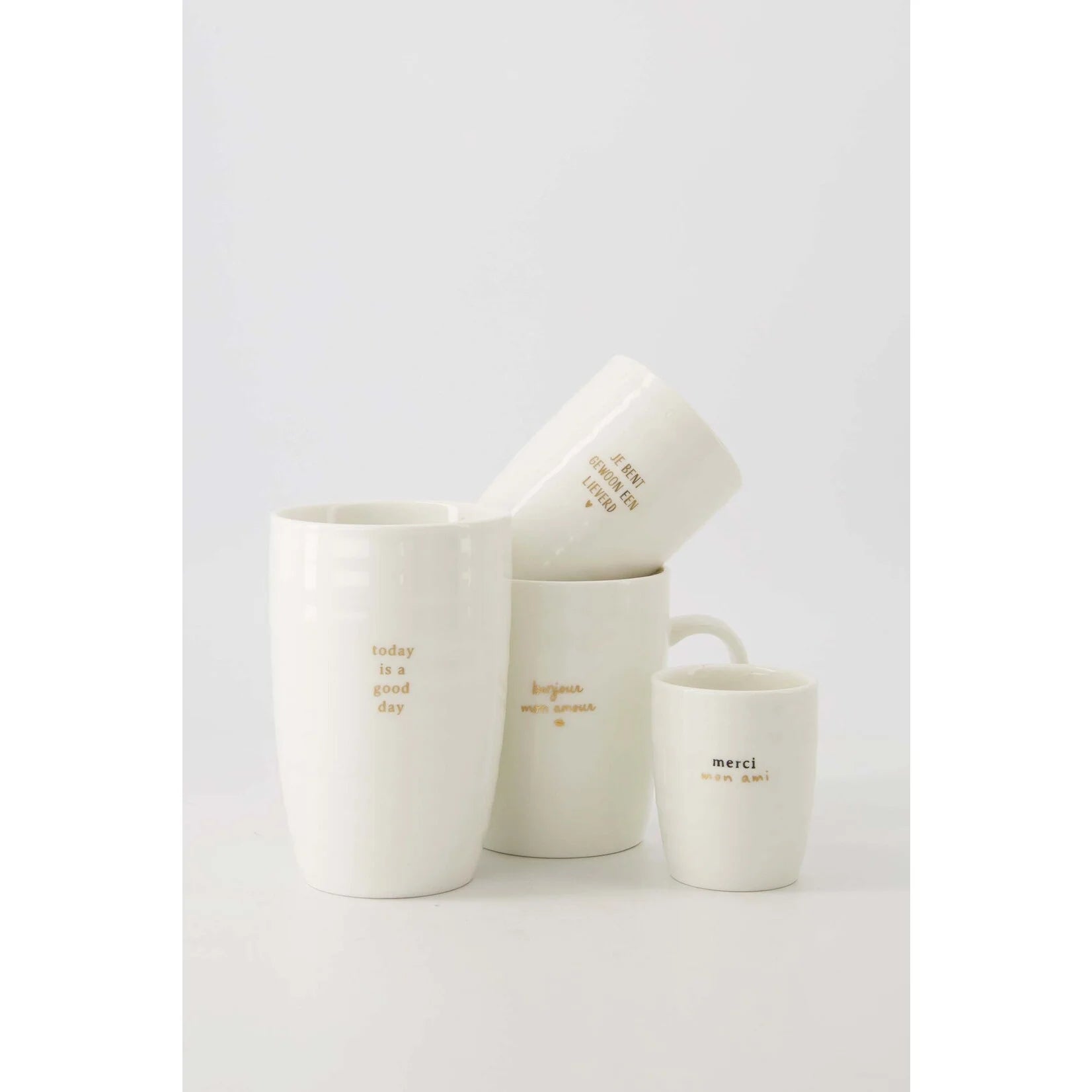 Mooie keramieken theemok met een goudkleurig opschrift "Bonjour mon amour".