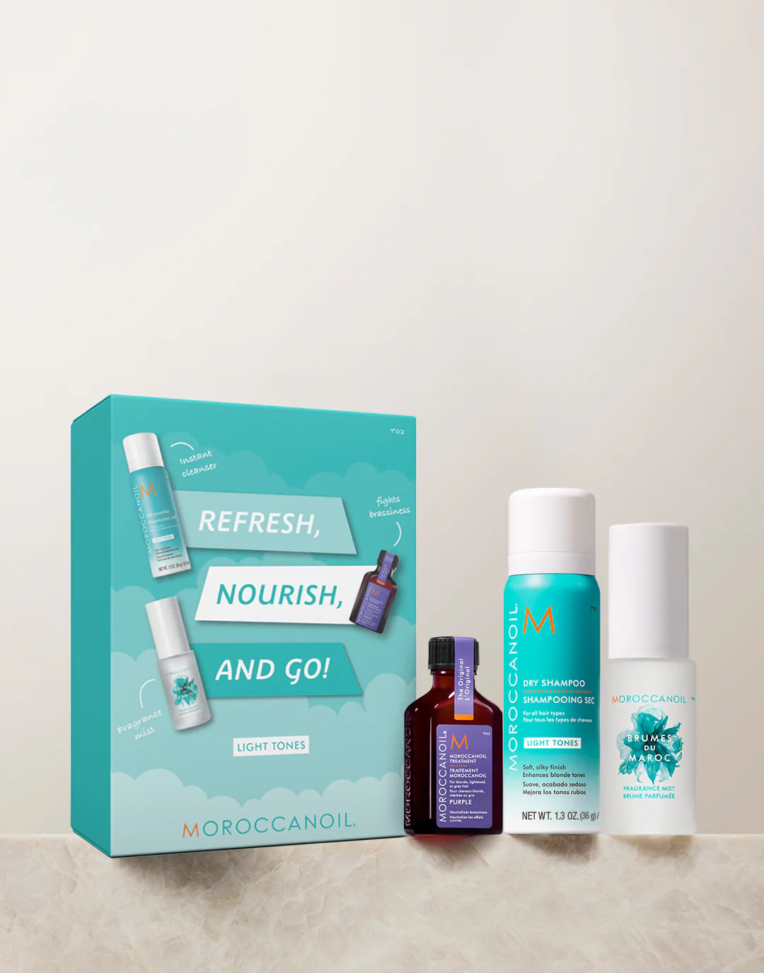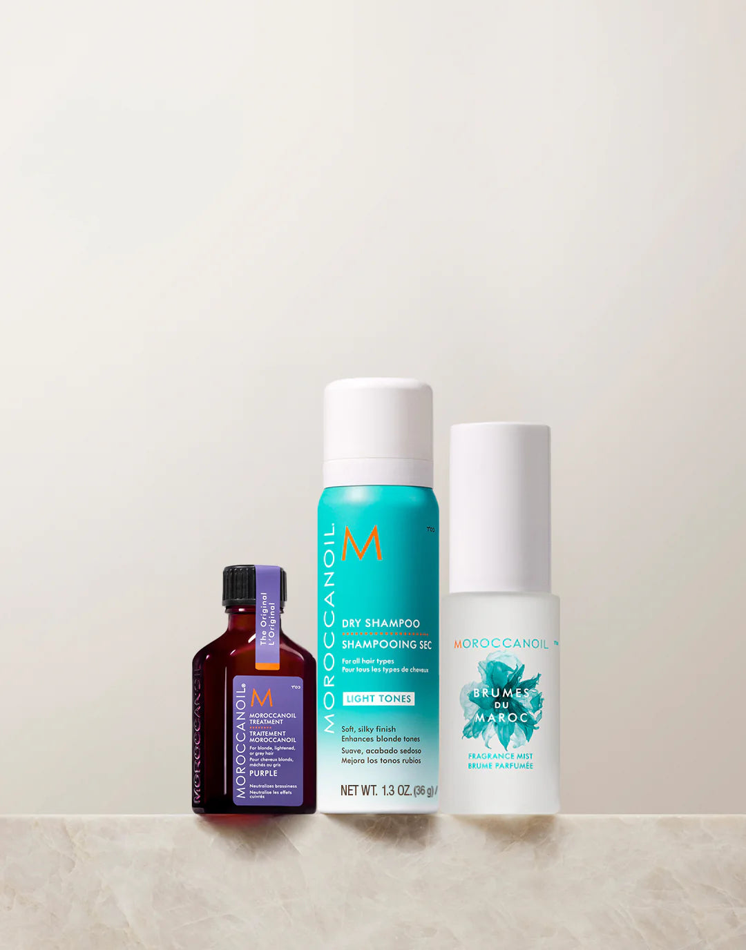 Reisformat essentials voor directe reiniging, verfrissing en voeding—met formules verrijkt met paarse pigmenten om brassiness in balans te brengen.
